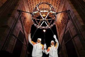 Geçmişin iki İtalyan kayak olimpiyat şampiyonu Alberto Tomba ve Deborah Compagnoni, Milano’daki Barış Kemeri’nde Leonardo da Vinci’nin düğüm desenlerinden esinlenen karmaşık bir kazanı yaktı.