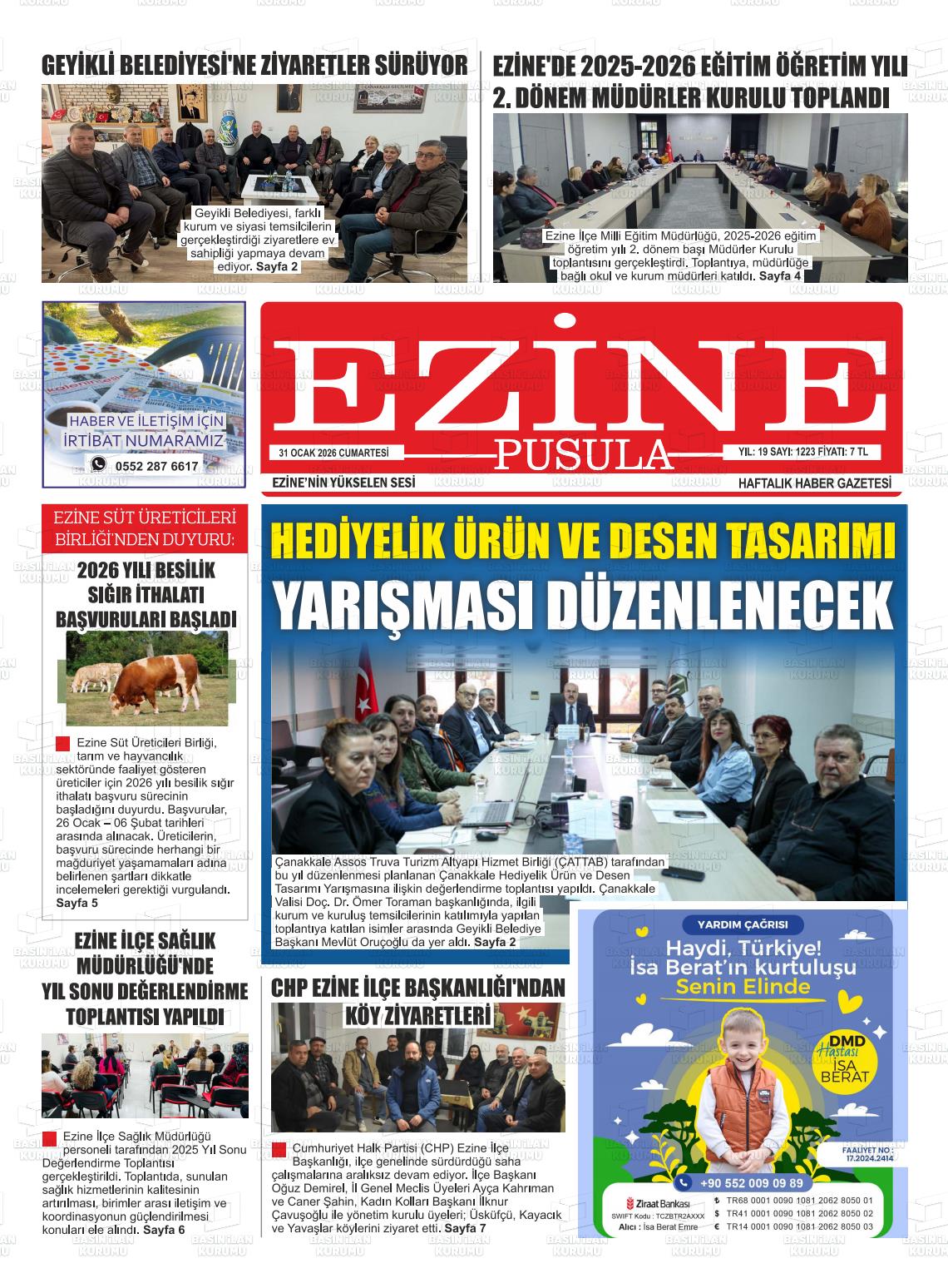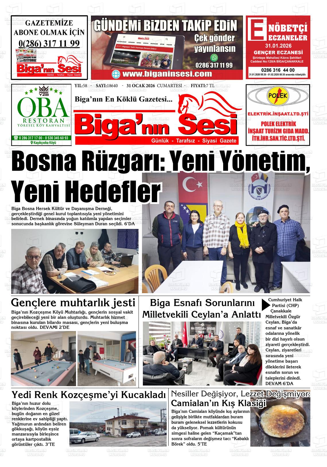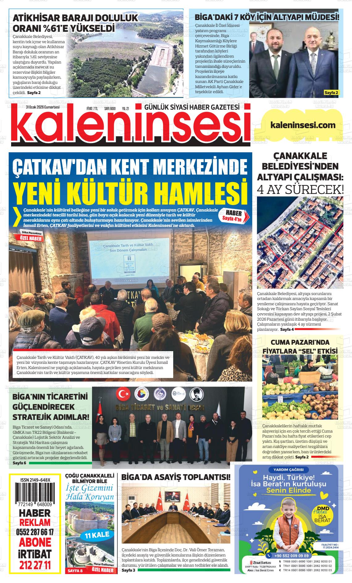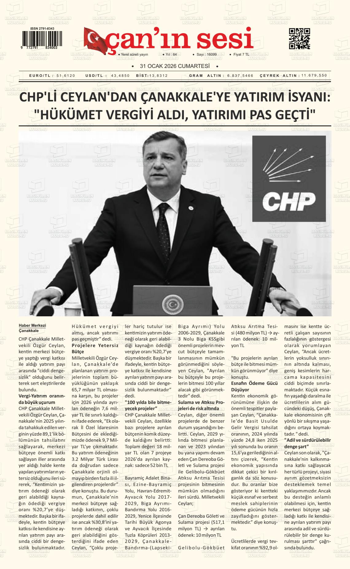 Çanakkale Yerel Gazeteleri 31 Ocak 2026, Cumartesi Günü Manşeti