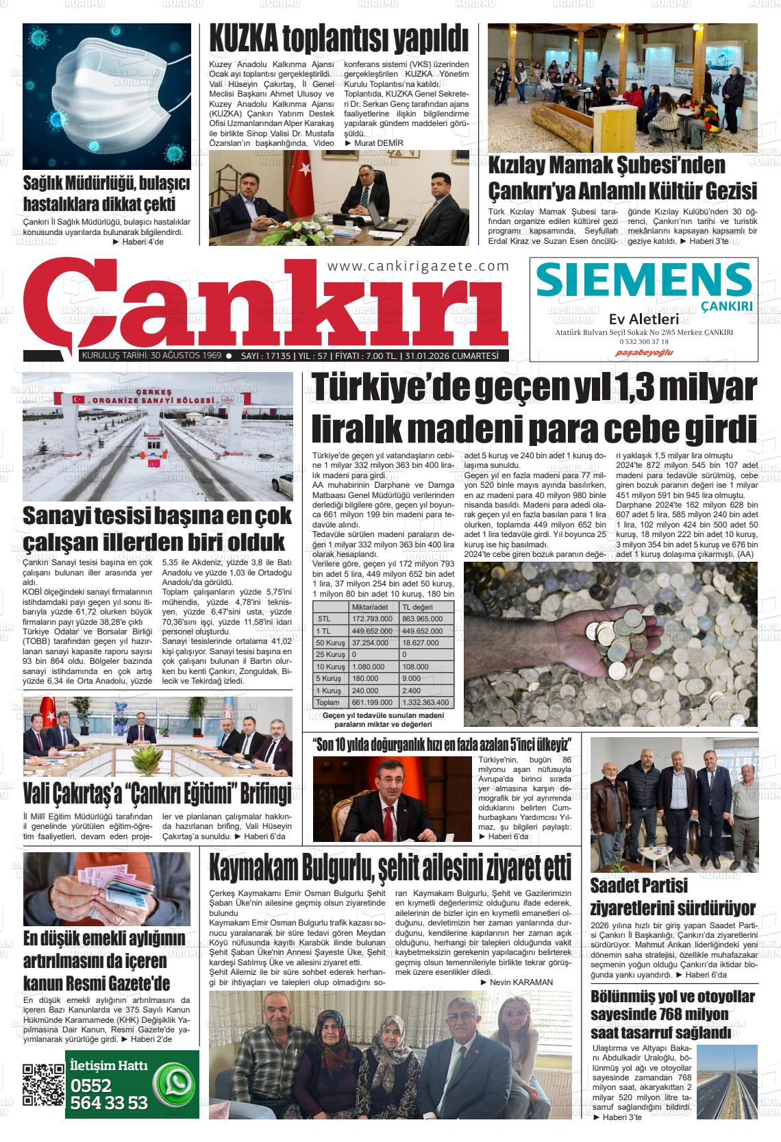 Çankırı Yerel Gazeteleri 31 Ocak 2026, Cumartesi Günü Manşeti
