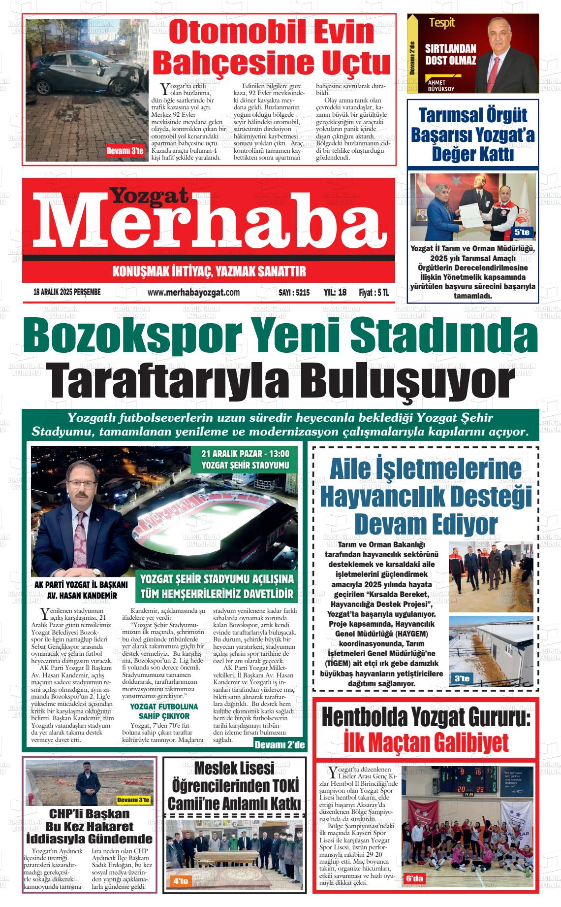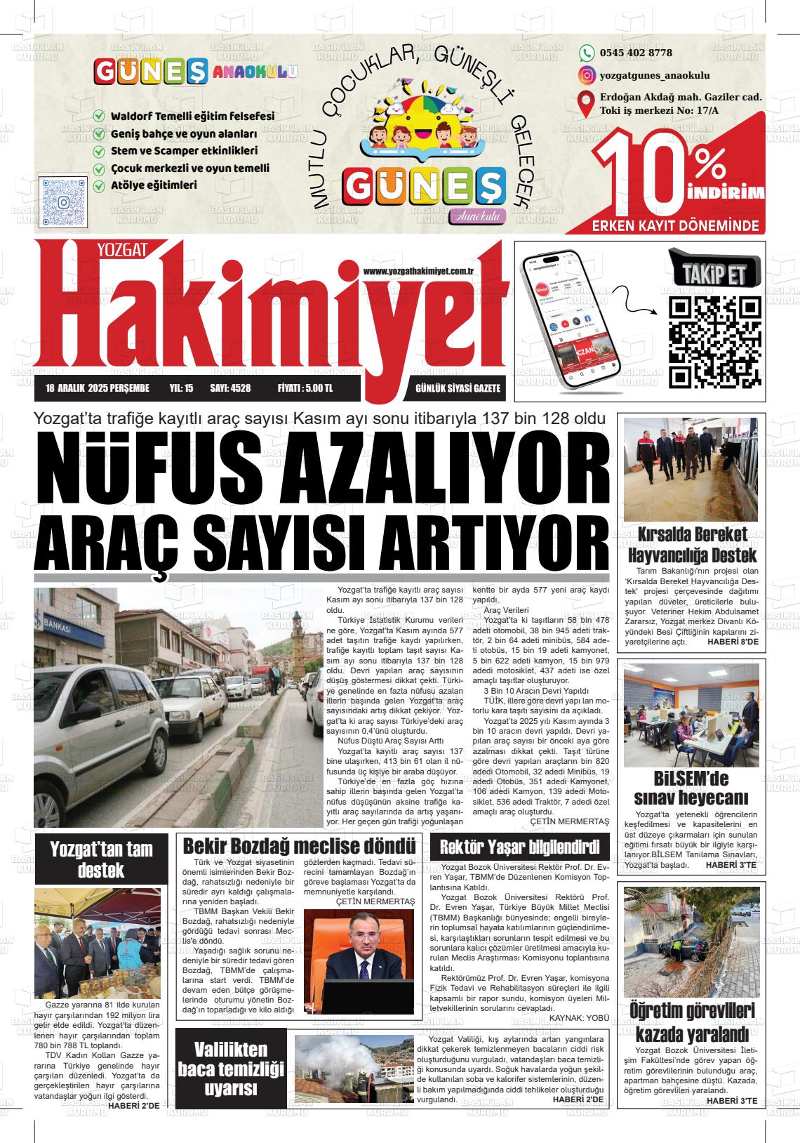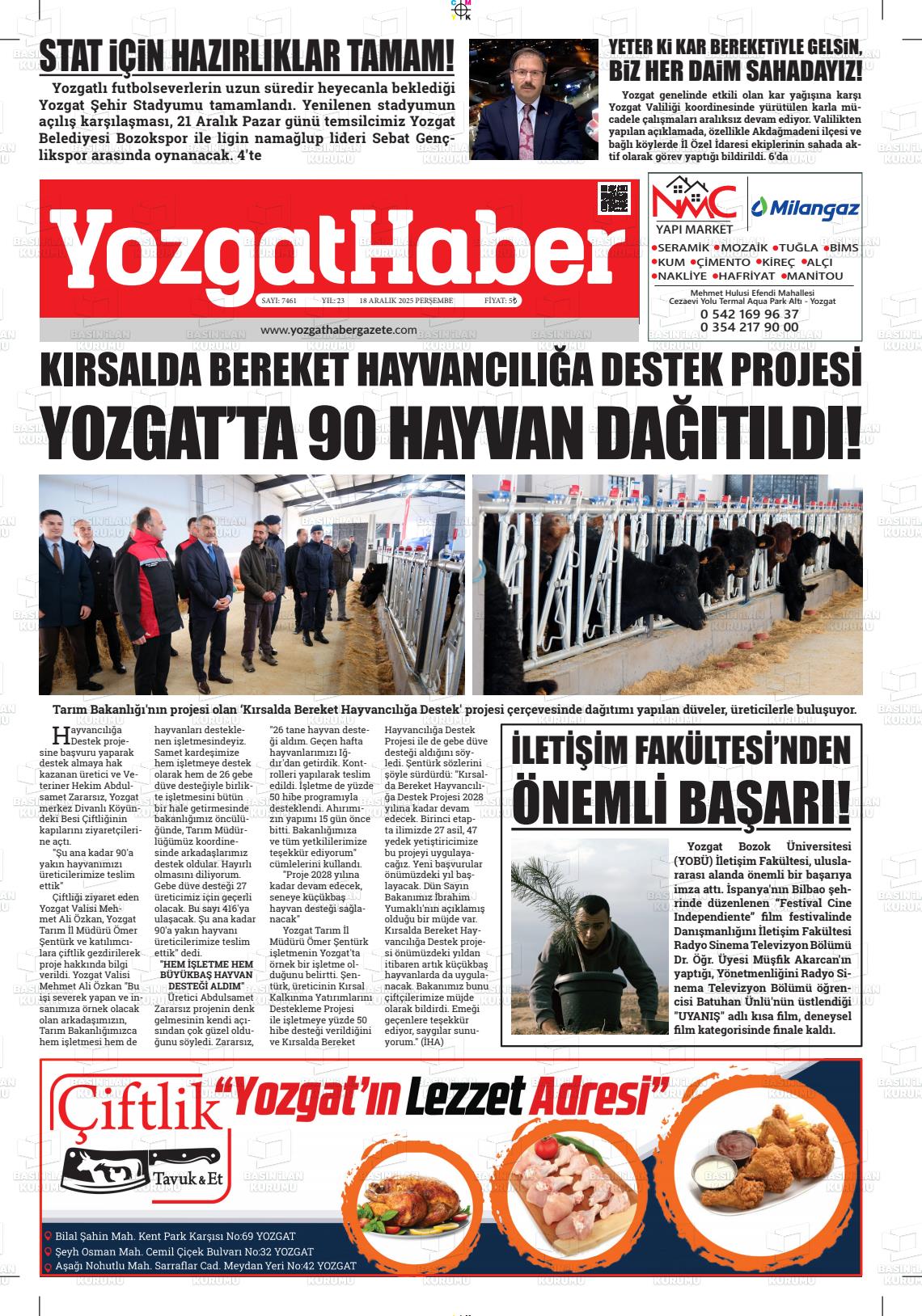 Yozgat Yerel Gazeteleri 18 Aralık 2025, Perşembe Günü Manşeti
