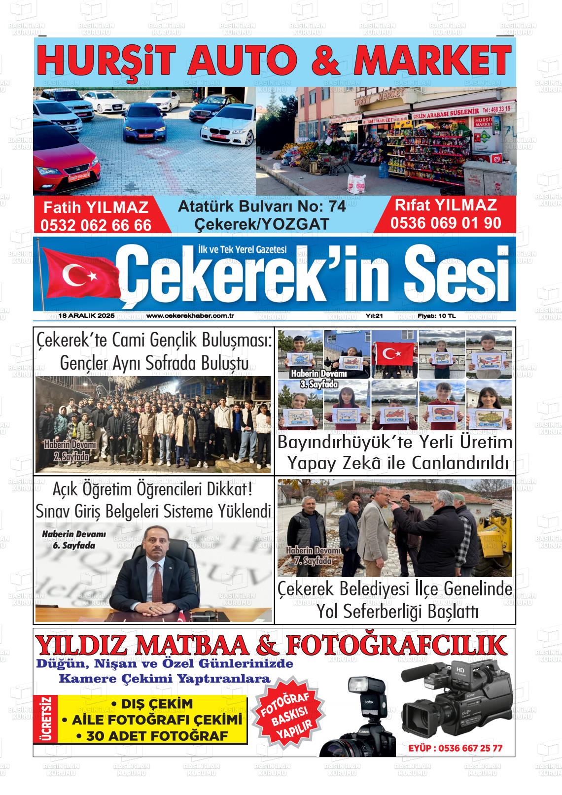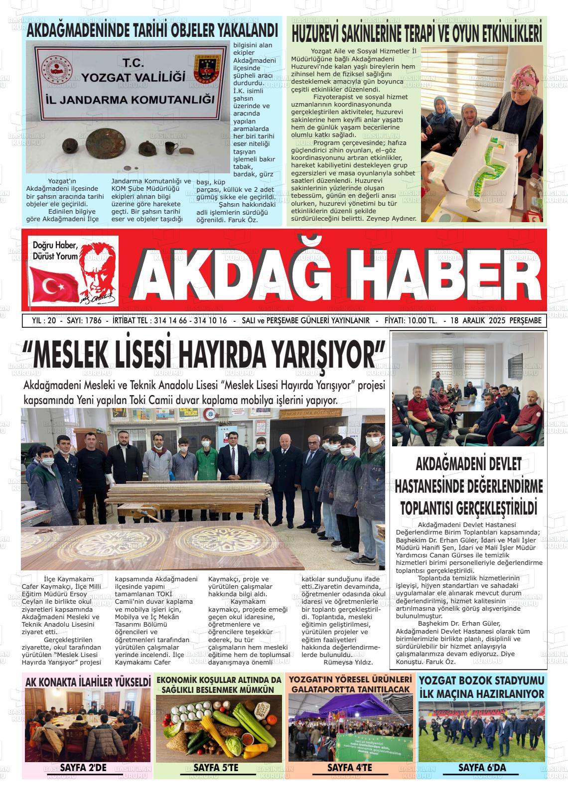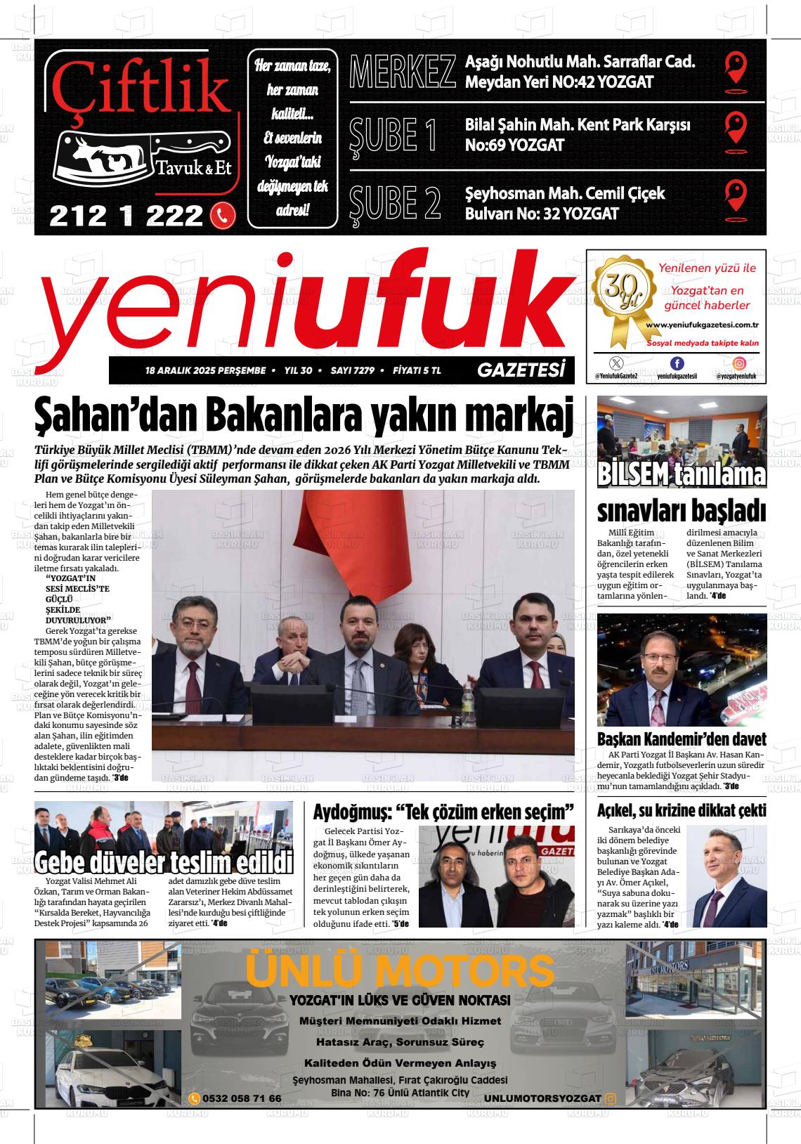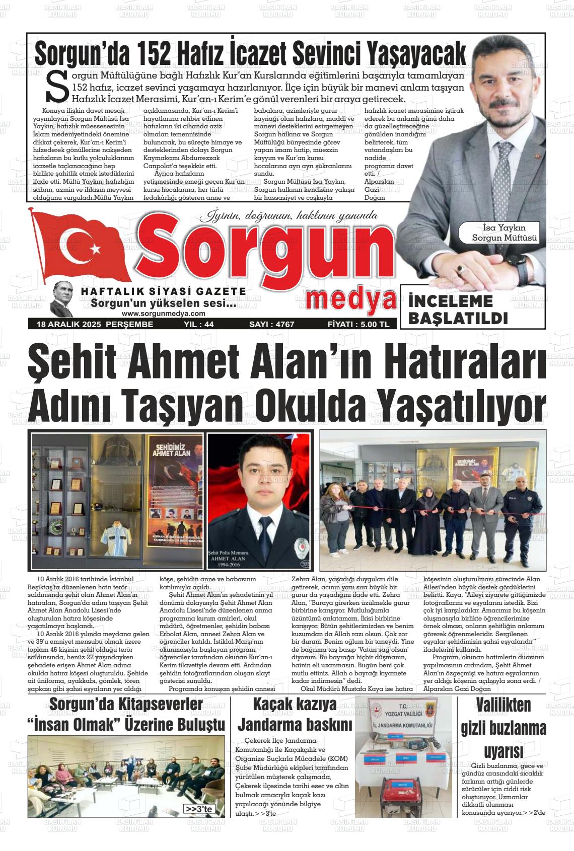 Yozgat Yerel Gazeteleri 18 Aralık 2025, Perşembe Günü Manşeti